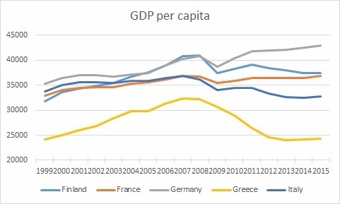 The problem of the euro can be visualized in the development of the GDP per capita.