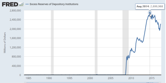 “Since the financial crisis, American banks have increased their excess reserves, that is, the cash funds they hold over and above the Federal Reserve’s requirements. Excess reserves grew from $1.9 billion in August 2008 to $2.6 trillion in January 2015.