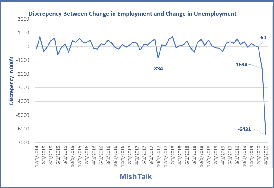 Discrepancy = Change in Employment Level – (-1 * Change in Unemployment Level)