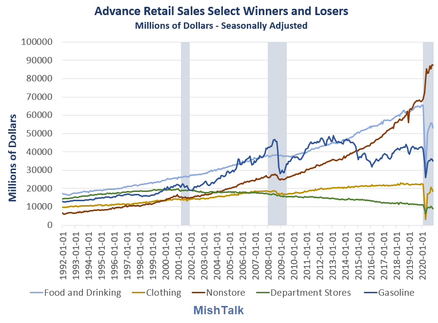 People don’t buy gasoline, food, or motor vehicles online. Motor vehicles buying patterns are slowing changing but those changes are not reflected in nonstore sales.