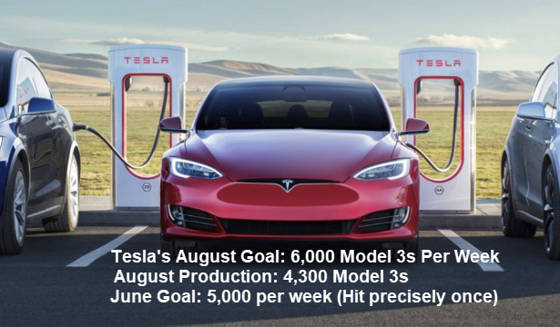 > Despite missing the August bogey, the obligatory “carrot on a string” followed immediately, with the article repeating that Tesla is on track to meet its overall third-quarter production goals. Tesla has been targeting total production of 50,000 to 55,000 Model 3 vehicles for the third quarter.