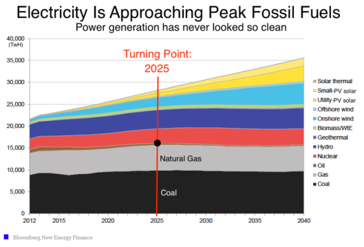 In contrast to peak oil forecasts that have been in vogue, BNEF says the World is on the Brink of Peak Fossil Fuels for Electricity.