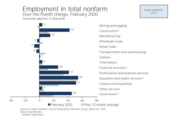 “Total nonfarm payroll employment rose by 273,000 in February, and the unemployment rate was little changed at 3.5 percent, the U.S. Bureau of Labor Statistics reported today. Notable job gains occurred in health care and social assistance, food services and drinking places, government, construction, professional and technical services, and financial activities.”