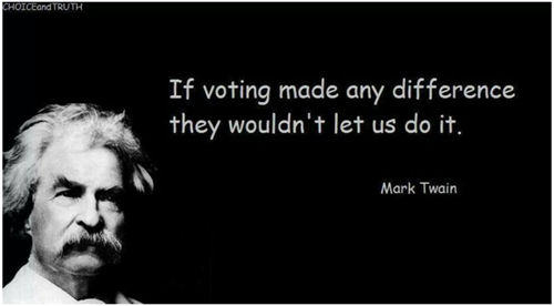 The statement “If voting changed anything, it would be illegal” is often attributed to Mark Twain, but Snopes reports that no one can cite any written reference or speech.