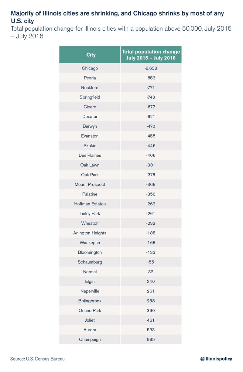 Chicago’s population declined by 8,638 people from July 2015 to July 2016, a larger loss than any other major American city. Illinois has 29 cities with 50,000 people or more, and 21 of those cities also shrank in total size.
