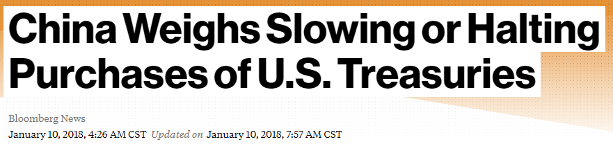 This is an astute piece by Mish. I think that China may be just rattling their saber a little in an attempt to head off increased US pressure regarding trade and North Korea. If they can make the Trump administration a little more wary about the potential end of cheap financing for our federal debt at a time much is riding on the deficit-financed tax cut, they probably figure that their timing is pretty good. I suppose they can buy USD-denominated corporate bonds or even stocks in lieu of US Treasuries (look at Swiss National Bank, for example), but my guess is that the Chinese government runs the risk of being regarded as imprudent if such corporate bonds or stocks materially displace their US Treasury holdings.