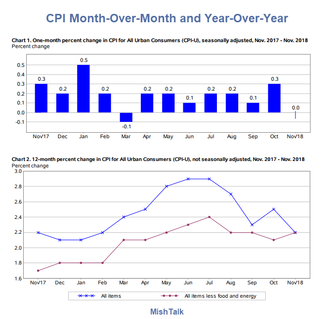 The BLS reports the CPI for All Items was unchanged in November as the price of gasoline fell while the price of shelter and food rose.