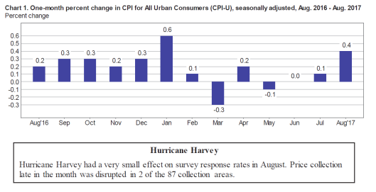 As expected in this corner, Hurricane Harvey had a little, if any impact this month. The BLS notes “Price collection late in the month was disrupted in 2 of the 87 collection areas.”