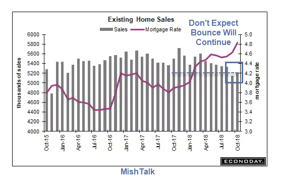 Your chart shows that in the last 2 years mortgage rates have risen from 3.5% to 4.85%. Have homes that were $400,000 in October of 2016 fallen to $340,000? They would have had to fall that much to keep the payment the same. It is inevitable that if sales prices don’t fall, sales volume will.