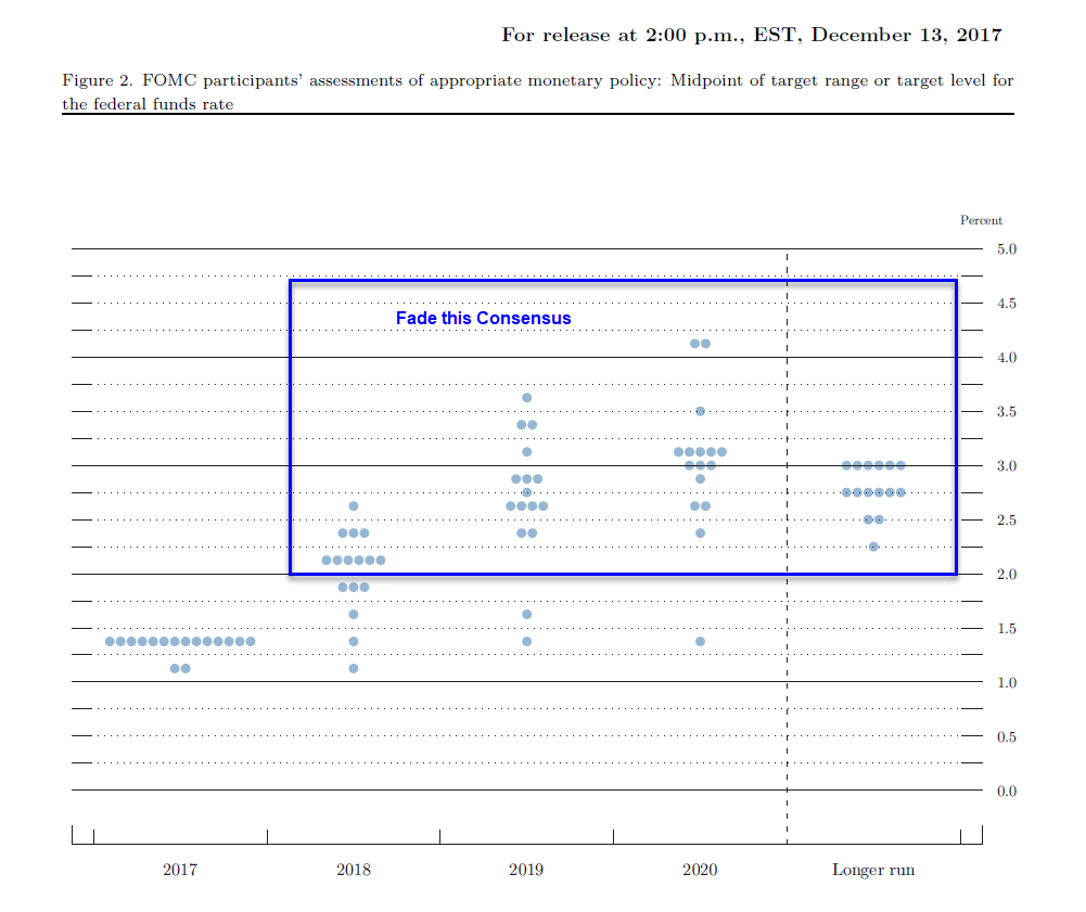 The Dot Plot, a survey of interest rate expectations, shows an expectation the Fed will hike to a range of 2.00% to 2.25% in 2018.