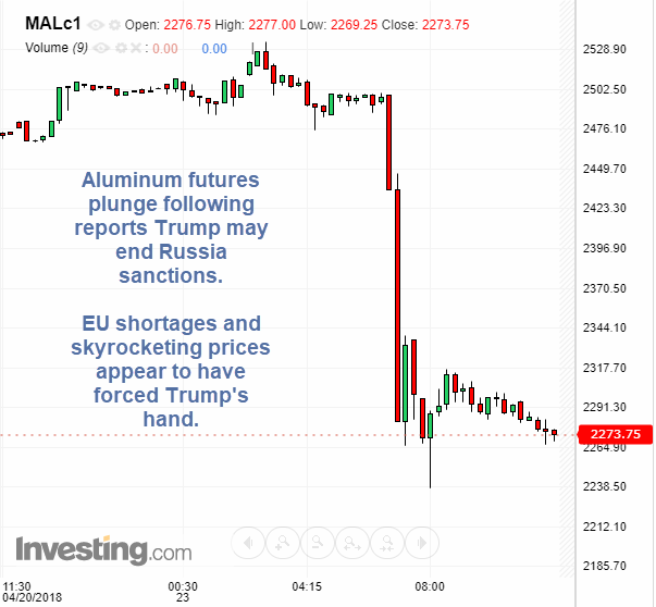 On Monday, the Treasury Department said it will consider easing the sanctions on Rusal if Deripaska divests. Alcoa (AA) stock lost 13.5%, Century Aluminum (CENX) 5.3% and Aluminum Corp. of China (ACH) 9.6%. The price of aluminum itself fell more than 5%.