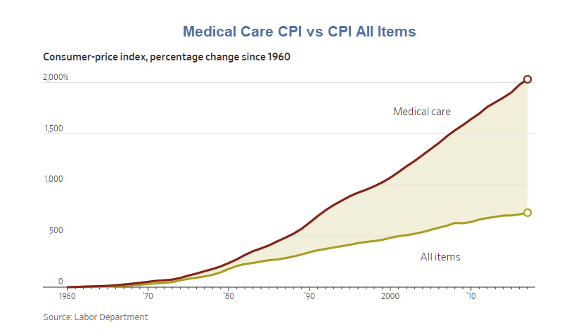 Health care price rises follow a general trend of the population (globally) toward obesity and diet related disease. A trend which corresponds exactly with reduced fat (an essential macro-nutrient) and increased starches (derived from corn and sugar) in our food chain. Consequently people are no healthier than they were 70 years ago, they just live longer due to medical intervention. Hence the “aging population” rhetoric.