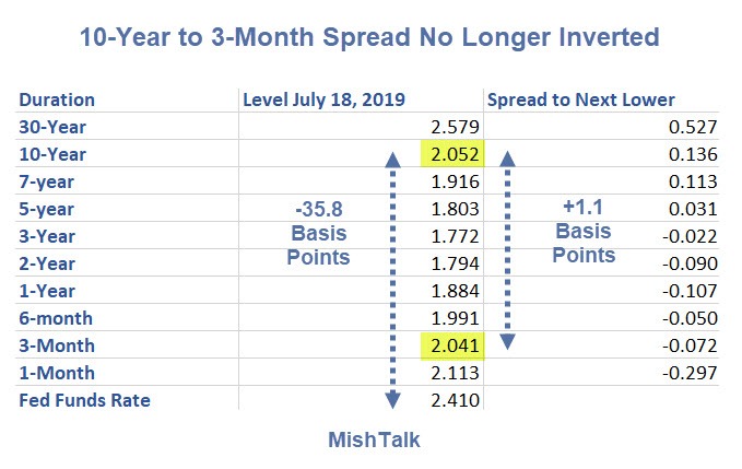This un-inversion, combined with the LEI data yesterday is a pretty strong signal that a recession will start in a year or so. Will it start before, or after the election?