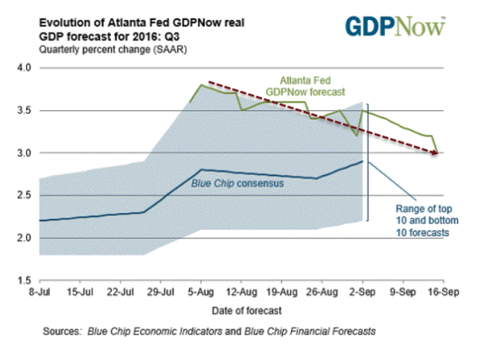 The GDPNow model forecast for real GDP growth (seasonally adjusted annual rate) in the third quarter of 2016 is 3.0 percent on September 15, down from 3.3 percent on September 9. The forecast of third-quarter real consumer spending growth declined from 3.4 percent to 3.1 percent after this morning’s retail sales report from the U.S. Census Bureau. The forecast of third-quarter real government spending growth declined from 1.3 percent to 0.8 percent after Tuesday’s Monthly Treasury Statement from the U.S. Bureau of the Fiscal Service.