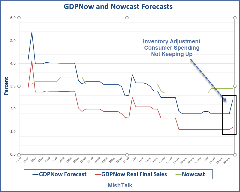 The GDPNow Forecast jumped 0.6% today, but 0.5 percentage points was an inventory adjustment.
