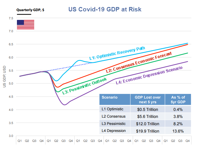 - L4: Economic Depression Scenario of a long-term recession with the economy tipped into depression, with “worst-case” estimates by economists and negative assumptions such as severe second waves of infection or protectionist politics.