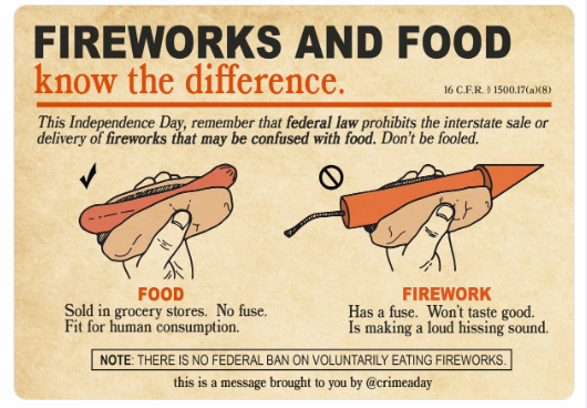 Warnings on fireworks are meaningless. The only people eating them are those who have graduated from Tide pods and need a new challenge.