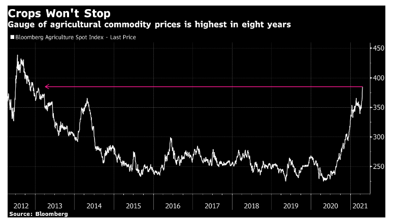 With global food prices already at the highest since mid-2014, this latest jump is being closely watched because staple crops are a ubiquitous influence on grocery shelves — from bread and pizza dough to meat and even soda.