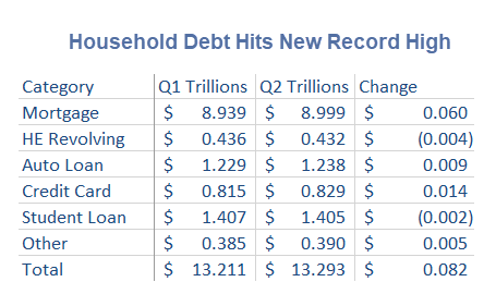 As a contrarian data point: the compounding rate from 2003 Q2 thru 2018 Q2 is 3.92% Given that many people think that inflation figures reported by the government are understated, the growth in the overall debt over the past 15 years simply seems to be following inflation with some shift out of credit cards and mortgages and into student loans. In fact, going back to 1999 data gives a compounded growth rate of 5.55% so the overal rate of growth has slipped from the 99-03 time frame.