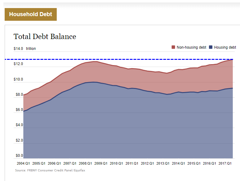Hooray! A New York Fed report on Household Debt and Credit shows household debt hit an all-time high in the third quarter of 2017.
