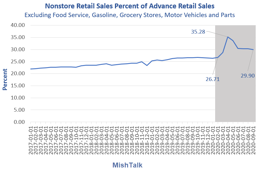 The chart shows nonstore retail sales / retail sales excluding restaurants, gasoline, grocery stores, and motor vehicles and parts.