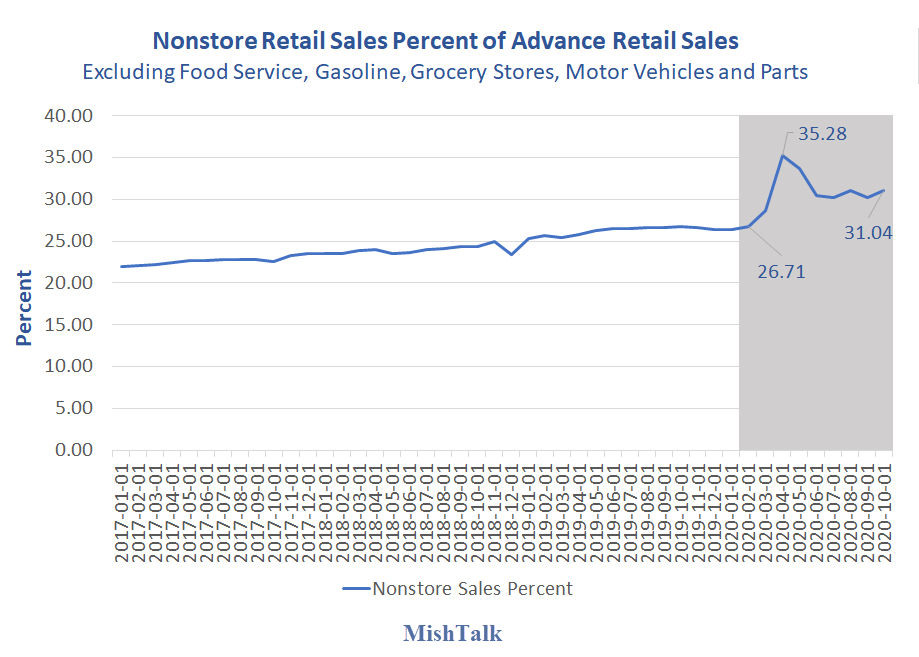 Of the remaining retail sales, nonstore retailers account for 31% of all retail sales.