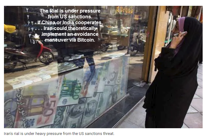 Not really sure what Bitcoin has got to do with it. Rupees and Yuan may be slightly inferior to USD as foreign reserves, but for the necessary dealings of a single country like Iran over a short to medium term, they are plenty accepted enough. If India, and/or China, doesn’t prevent people from trading with Iran, Indians and Chinese will do so. Buying, either locally or abroad, whatever Iran can pay for in Rupees/Yuan….