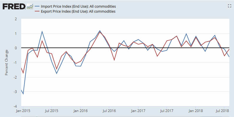- All Imports Excluding Fuel: Nonfuel import prices edged down 0.1 percent in August, after decreasing 0.3 percent in each of the previous 2 months. In August, the decline was driven by falling prices for nonfuel industrial supplies and materials, although lower capital goods prices also contributed. In contrast, the price index for foods, feeds, and beverages advanced in August. Despite the downward trend over the past 3 months, nonfuel import prices increased 0.9 percent between August 2017 and August 2018. The increase was led by a 6.4-percent rise in nonfuel industrial supplies and materials prices over the 12-month period.