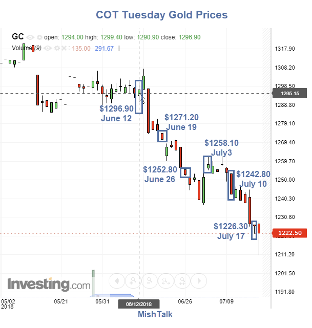 My lead-in chart plots the price of gold as of the close of every Tuesday starting June 12.