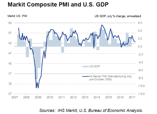 Markit’s chief economist keeps his 1st quarter GDP estimate at 1.7% but estimates the 2nd quarter will get off to a rocky start at 1.1%.