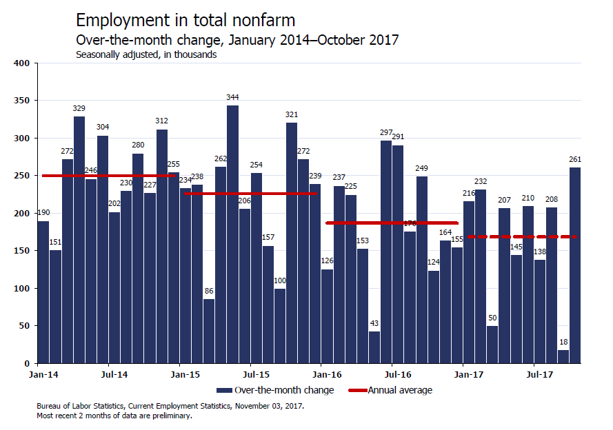 The unemployment rate declined to 4.2 percent in September; total nonfarm payroll employment changed little (-33,000). A sharp employment decline in food services and drinking places and below-trend growth in some other industries likely reflected the impact of Hurricanes Irma and Harvey.