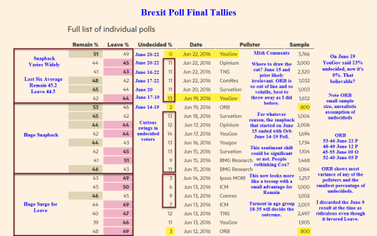 The surge for leave peaked on June 13 or so, before the Jo Cox murder. Many claim “I told you so.”