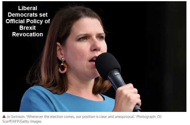 The Liberal Democrat leader, Jo Swinson Supports Brexit Cancellation and will write that into its election manifesto.