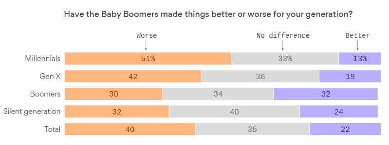 Beset by big college loans, inheriting two wars, and facing an uncertain future of work, a majority of millennials say baby boomers have made things worse for them — and a lot of boomers agree, according to a new Axios/SurveyMonkey poll.