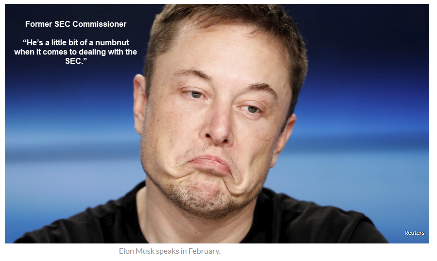 “ Musk might be a genius when it come to electric cars and space travel, but he’s a little bit of a numbnut when it comes to dealing with the SEC.”