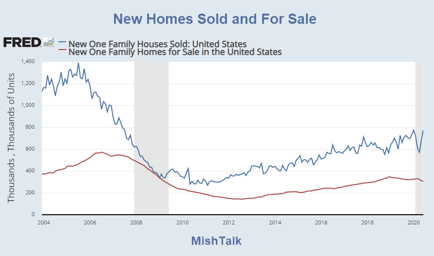 As reported in the New Residential Sales report for June, sales of new single-family houses in June 2020 were at a seasonally adjusted annual rate of 776,000.