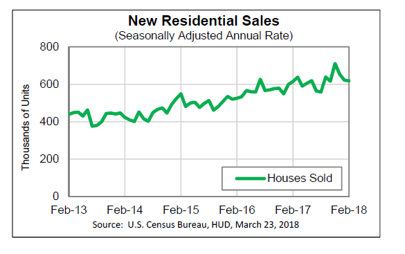 - New Home Sales: Sales of new single-family houses in February 2018 were at a seasonally adjusted annual rate of 618,000, according to estimates released jointly today by the U.S. Census Bureau and the Department of Housing and Urban Development. This is 0.6 percent (±13.3 percent)* below the revised January rate of 622,000, but is 0.5 percent (±16.6 percent)* above the February 2017 estimate of 615,000.