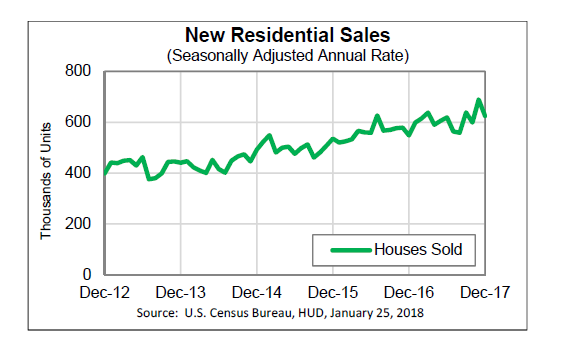 The headline 9.3 percent decline in new home sales for December masks what is actually a solid new home sales report. December’s 625,000 annualized rate is the fourth best of the expansion and follows November’s revised 689,000 rate which is the very best. And importantly supply moved into the market, up 3.9 percent at 295,000 units. On a sales basis, supply improved to 5.7 months from November’s 4.9 months.