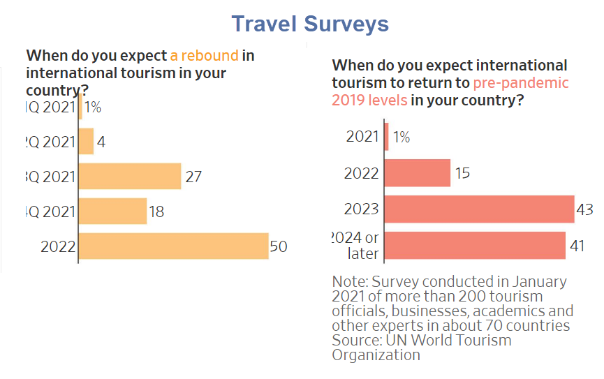 After declaring that 2020 was the worst year for tourism on record, with one billion fewer international arrivals, the United Nations World Tourism Organization says prospects for a 2021 rebound have worsened. In October, 79% of experts polled by the agency believed a 2021 rebound was possible. Only 50% said they believed that in January, and some 41% didn’t think travel would reach pre-pandemic levels until 2024 or beyond.
