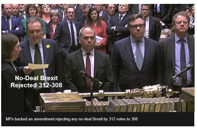 The BBC reports MPs Vote to Reject No-Deal Brexit.