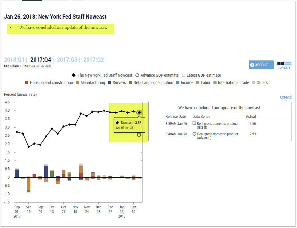 The final Nowcast estimate for 4th quarter GDP is an anticlimactic 3.9% today vs. the actual BEA estimate of 2.6%. The forecast for the first quarter is 3.1%.