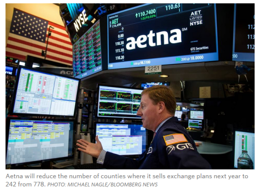 The Wall Street Journal reports Aetna will reduce the number of counties where it sells exchange plans next year to 242 from 778.
