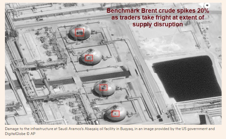 The Financial Times reports Oil prices jump 20% After Attacks Halve Saudi Output.