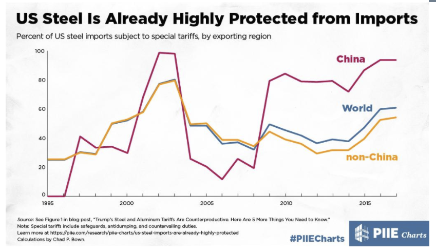 The Peterson Institute for International Economics (PIIE) reports US Steel Is Already Highly Protected from Imports.