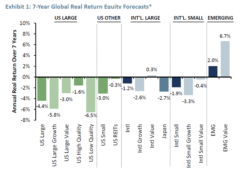The report, which I highly recommend reading states, “*The chart represents local, real return forecasts for several asset classes and not for any GMO fund or strategy. These forecasts are forward-looking statements based upon the reasonable beliefs of GMO and are not a guarantee of future performance.”