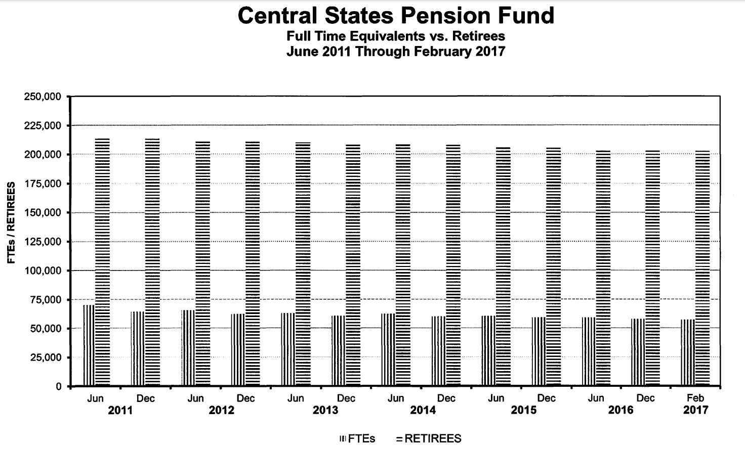 There are over 200,000 retirees backed by 60,000 or so employees contributing to the plan. Moreover, the plan assumes 6% returns at a time when 10-year treasuries 2.4%.