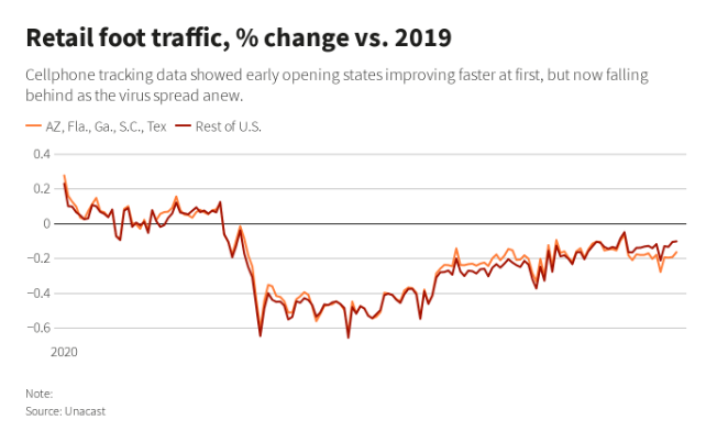 In Arizona, Texas, Florida, Georgia and South Carolina, which had edged ahead of other states during their drive in May to reopen commerce, retail foot traffic has slipped below levels elsewhere, information from data firm Unacast showed.