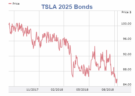 > $1.8 billion of Tesla bonds due in August 2025 plunged to a record low on Friday. The bonds traded for just 84 cents on the dollar, down from 98 cents a year ago. The yield, which moves opposite price, almost doubled over that span to 8.6%.