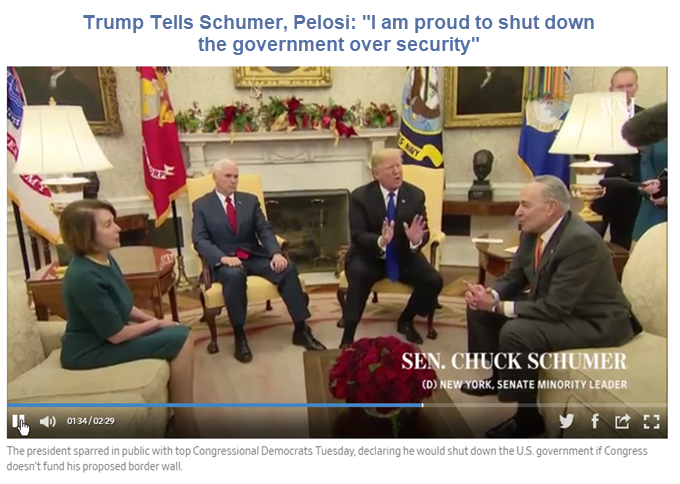 On Tuesday Trump Threatened to Shut Down Gov’t in Oval Office Feud with Pelosi, Schumer if Congress did not fund his wall.