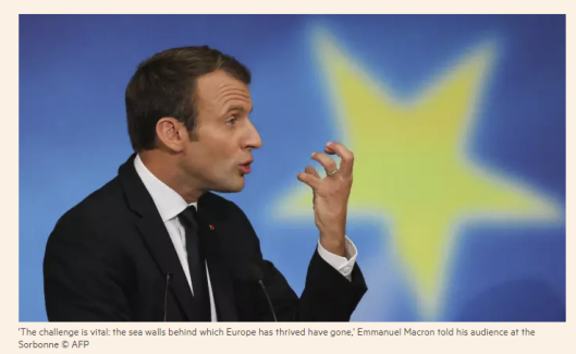 Macron seeks “bold” actions. He wants an EU “military intervention force”, a common budget, carbon taxes, national conventions to discuss the future of Europe, trade prosecutors to enforce countries to stick with the rules, and a Franco-German cooperation treaty,
